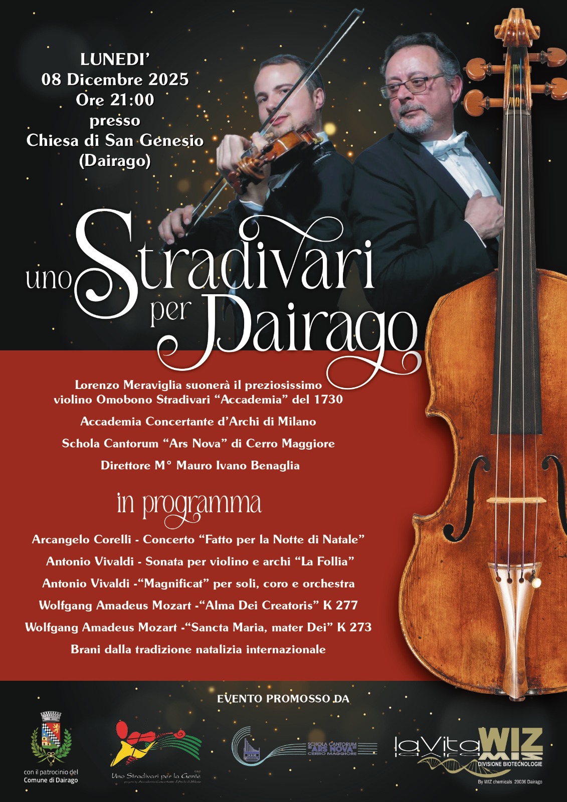 Lunedì 8 dicembre alle ore 21.00 nella Chiesa Parrocchiale di San Genesio, dopo lo straordinario successo dello scorso anno, torna a Dairago il prestigioso Violino Omobono Stradivari “Accademia” del 1730.