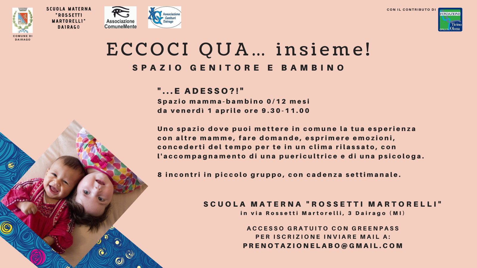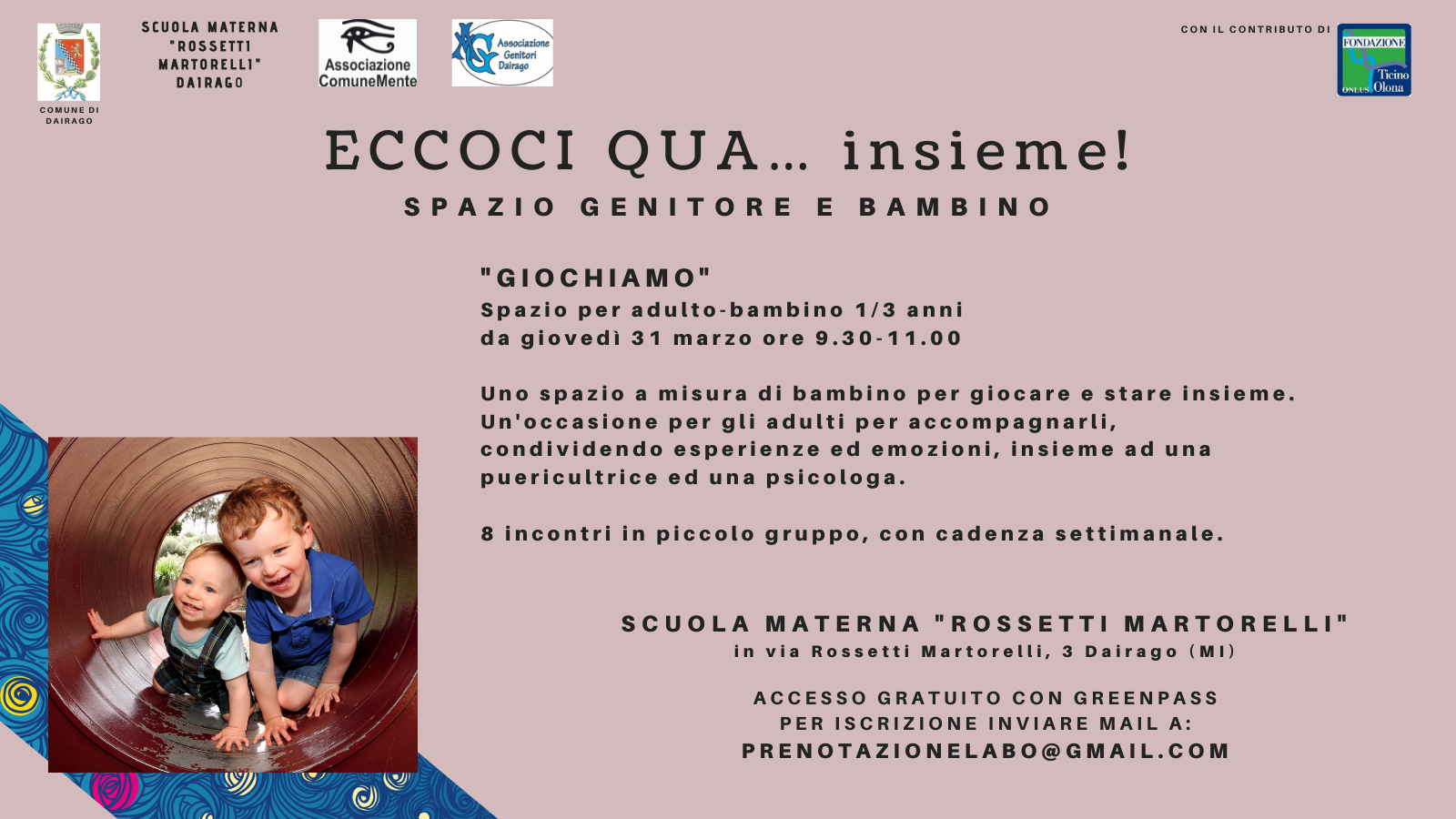 Il Comune di Dairago tramite i finanziamenti della FONDAZIONE TICINO OLONA ONLUS ed in collaborazione con l' Associazione ComuneMente, la Scuola materna Rossetti Martorelli di Dairago, l' Istituto Comprensivo Statale “Silvio Pellico” di Arluno e l' Associazione Genitori di Dairago propone una serie di incontri dedicati a genitori e bambini dai 0 ai 3 anni.